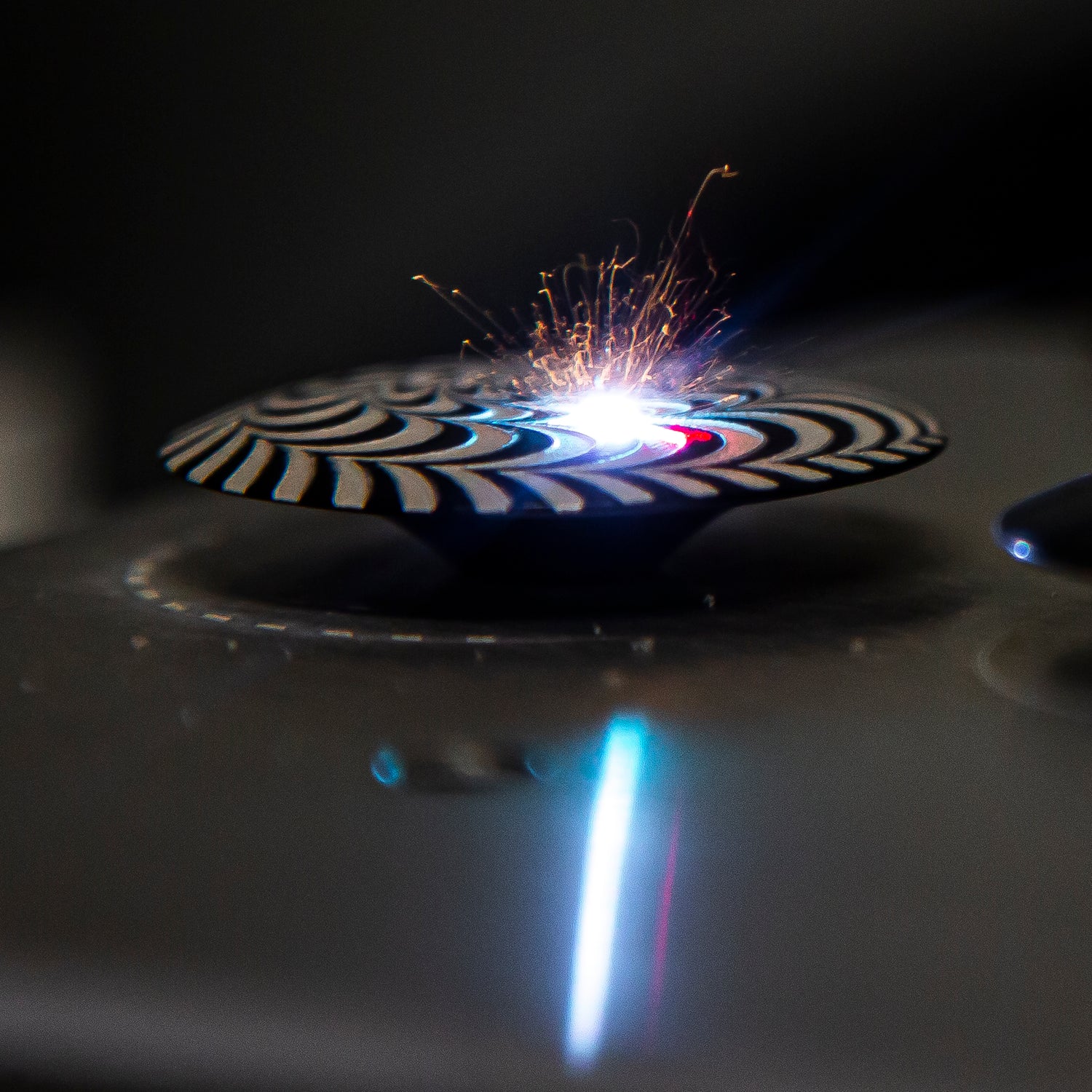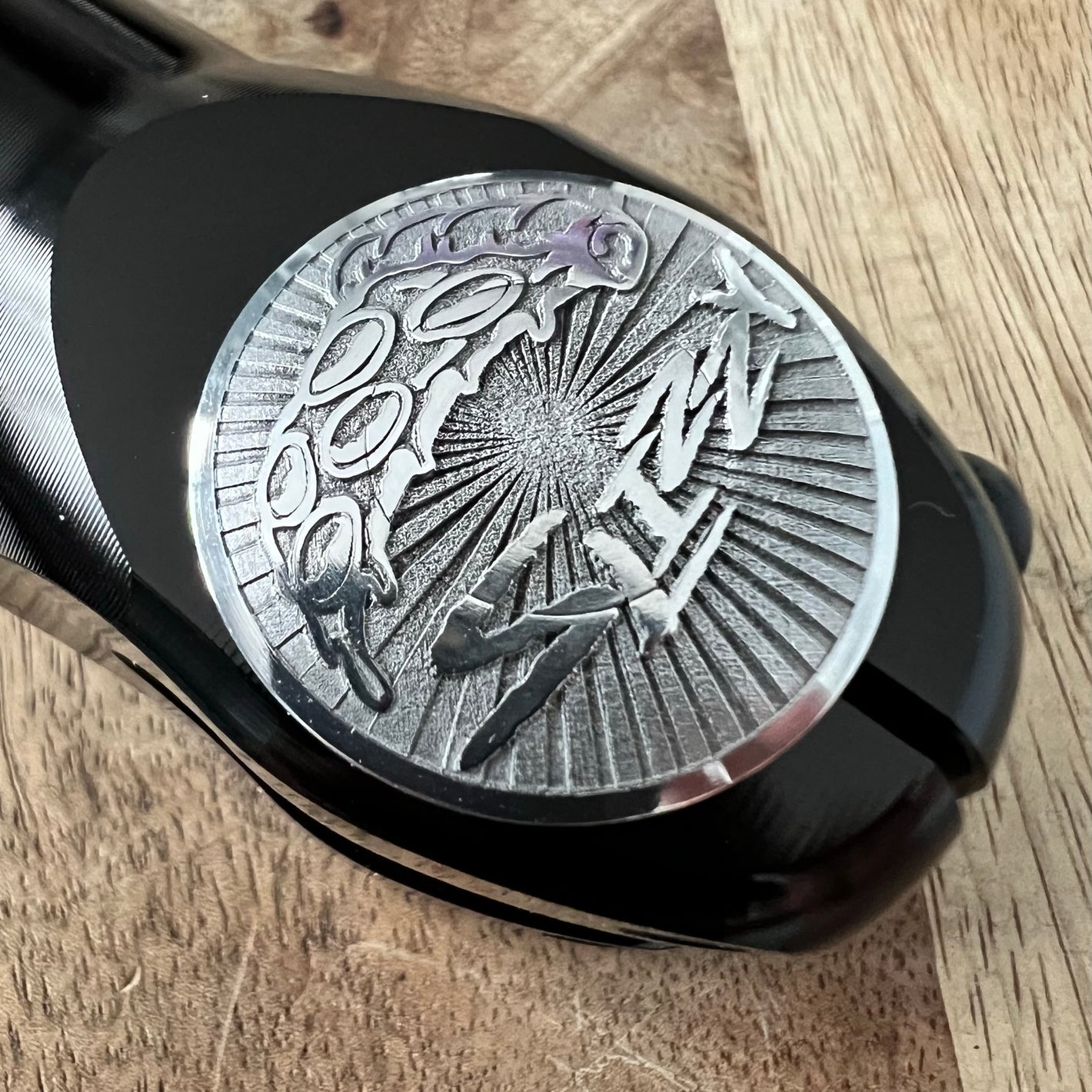 Our deep laser engraved top caps have the art feature permanently cut into the top cap. we literally focus our lasers to ablate the material directly off the top cap creating deep cut art.