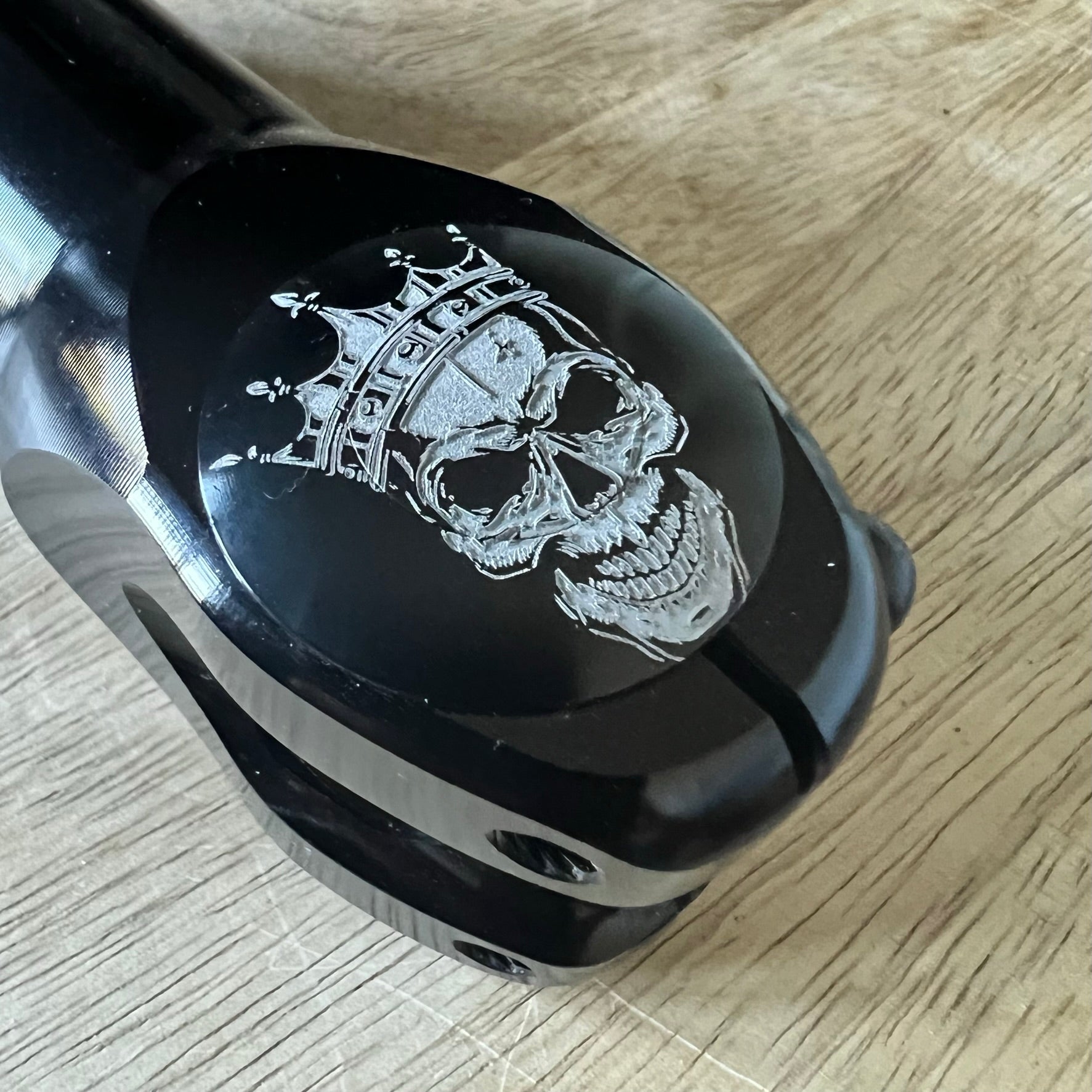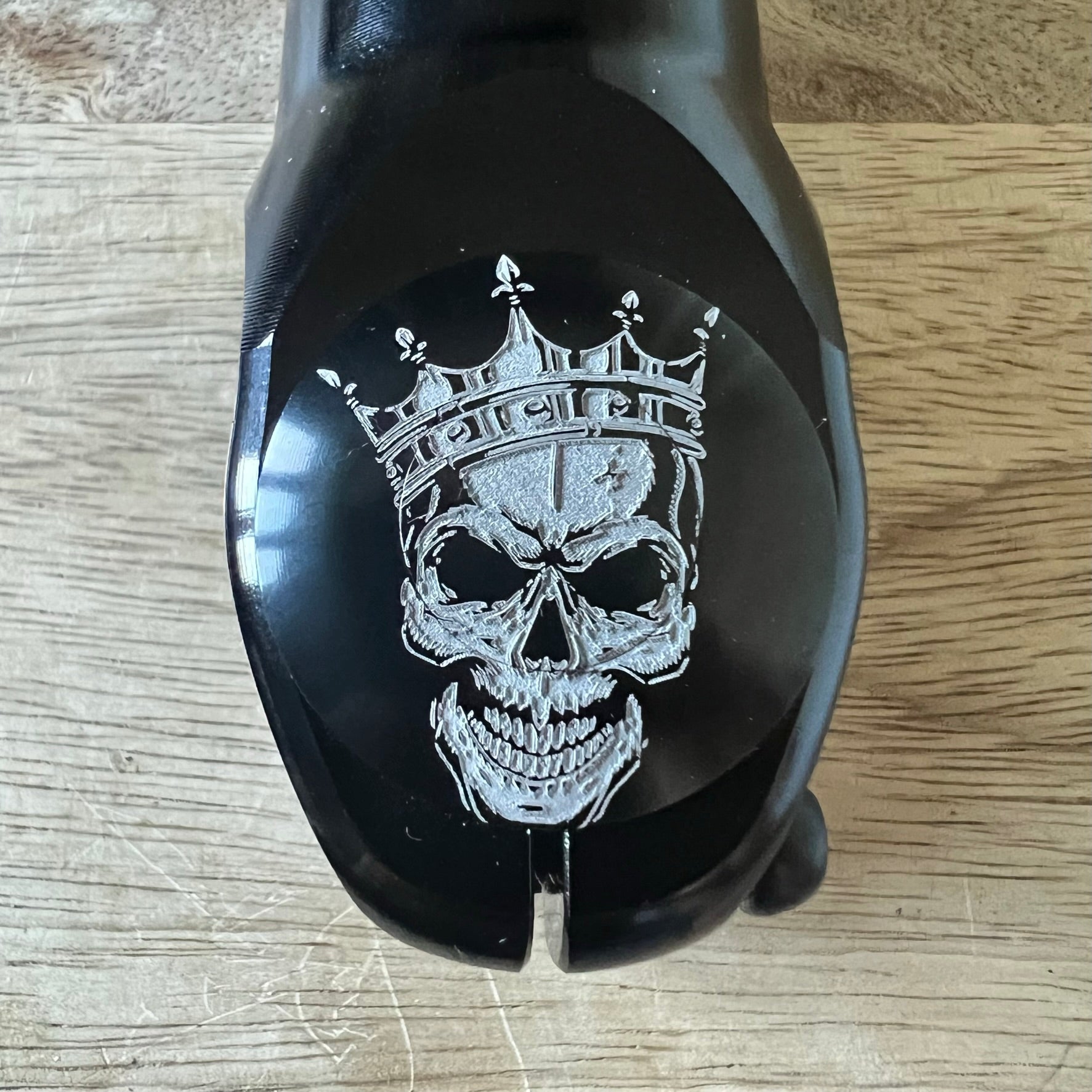 Skull King Hidden Bolt Top Cap - This cap is destined to set off your ride every time. Deep Laser engraving creates n image cut right into the top cap. It will never wear off or fade.