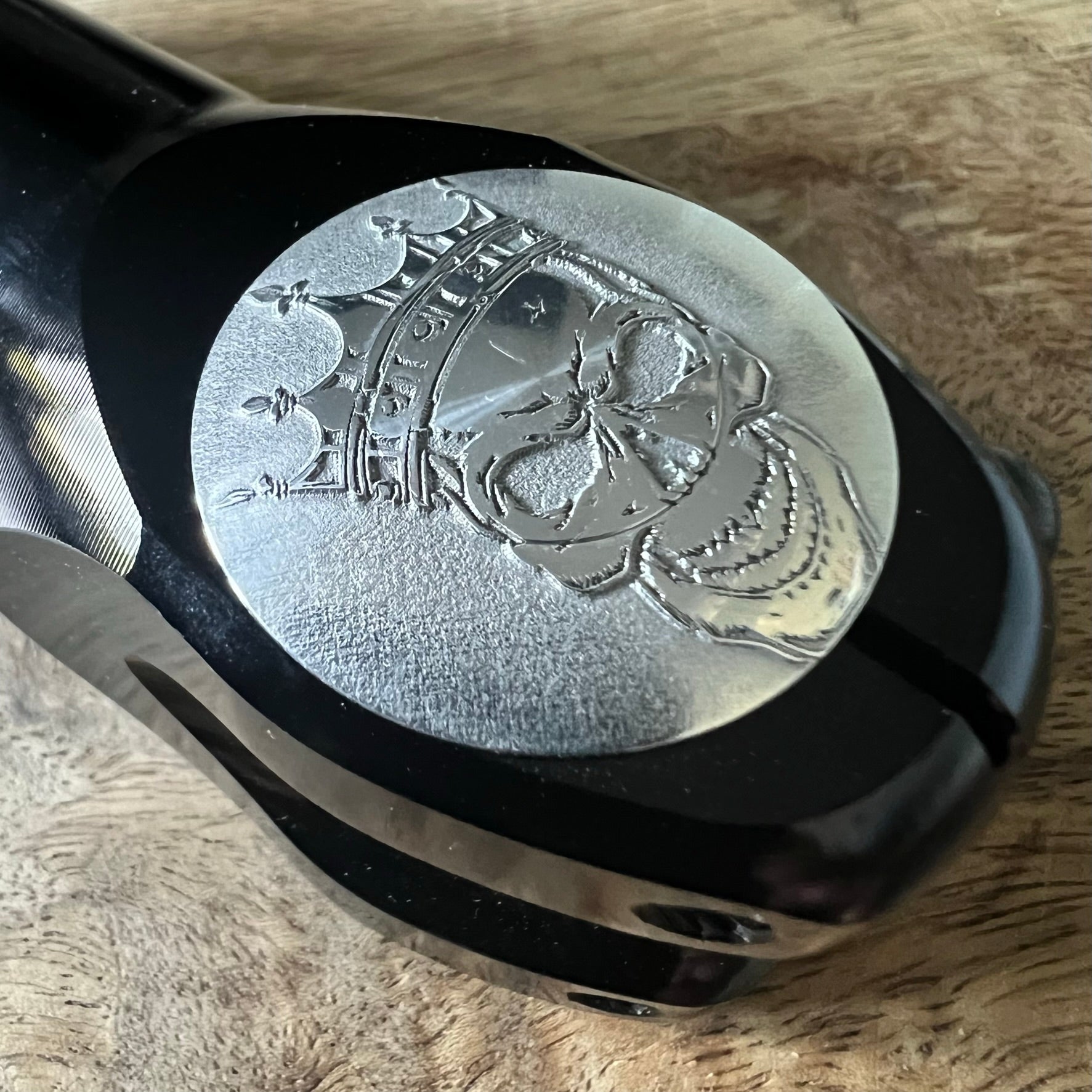 Skull King Hidden Bolt Top Cap - This cap is destined to set off your ride every time. Deep Laser reverse engraving creates a 3D image that pops right off the top cap. The cap is then sanded and polished so that the background is distressed and the art is polished to a mirror shine. Its an absolute show piece.