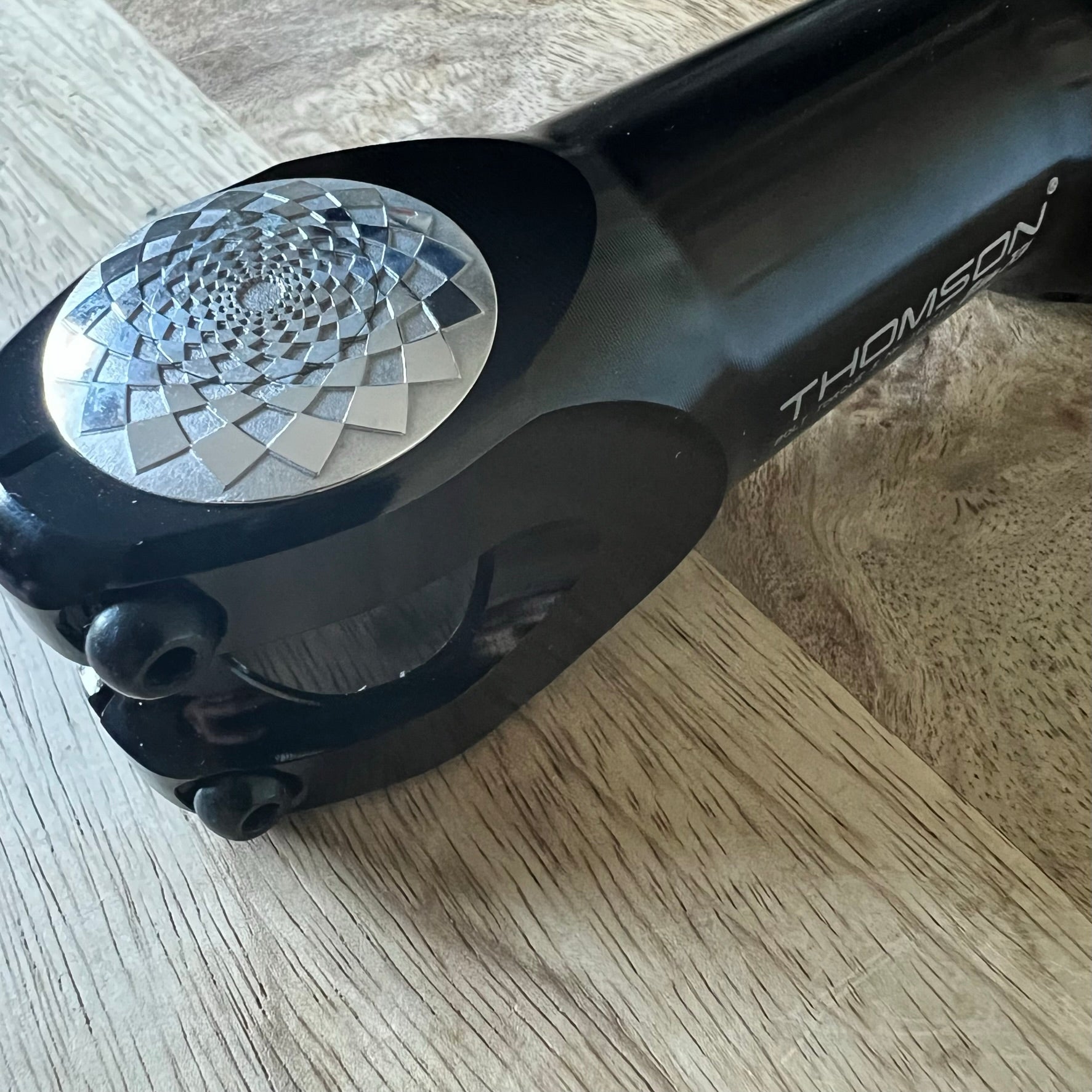 Easy Installation: Installing the two-piece stem top cap is a breeze. Simply install the lower half of the top cap with the supplied bolt. Then, attach the engraved center cap to cover the bolt, complete the art, and finalize the assembly.