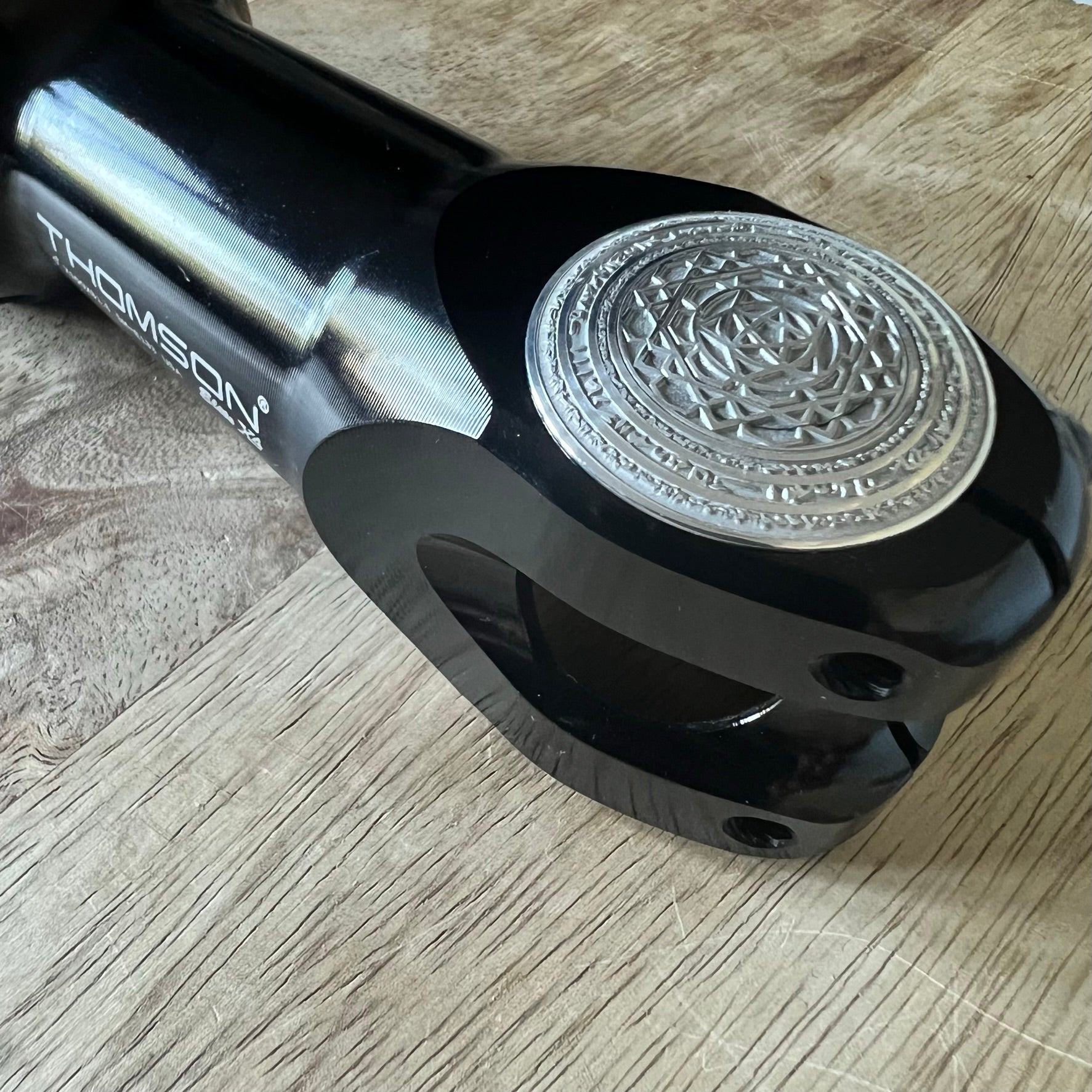 Easy Installation: Installing the two-piece stem top cap is a breeze. Simply install the lower half of the top cap with the supplied bolt. Then, attach the engraved center cap to cover the bolt, complete the art, and finalize the assembly.