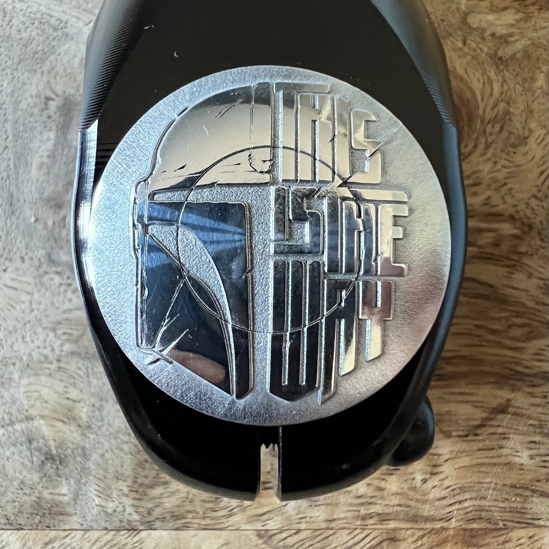 Introducing the Mandalorian "This is the Way" Bicycle Stem Top Cap! Embark on an epic cycling journey with the iconic Mandalorian phrase adorning your bike. This top cap is the perfect way to showcase your love for the hit series while adding a touch of galactic style to your ride.